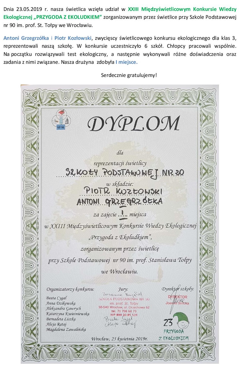 Dnia 19.10.2022 r. w SP 90 odbył się XXV Międzyświetlicowy konkurs wiedzy ekologicznej „Przygoda z Ekoludkiem”. Naszą świetlicę reprezentowała drużyna, wyłoniona podczas ekologicznego konkursu świetlicowego dla klas trzecich: Antonina Micach i Szymon Berdowski. Uczniowie na początku rozwiązywali test, a następnie wykonywali doświadczenia, zadania, których wyniki zapisywali w karcie odpowiedzi. Jury po zliczeniu punktów ogłosiło zwycięzców. Nasza drużyna zdobyła II miejsce.